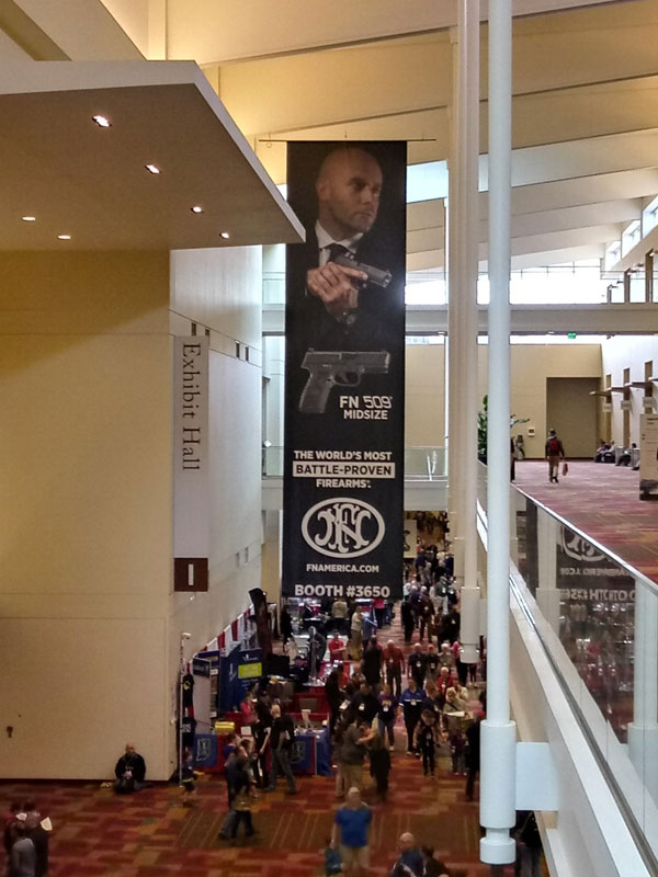 Indiana is not known for gun-free zones and outside the convention, men open carrying rifles patrolled the streets. Just outside the Indiana Convention Center, one block North on Capitol Avenue, a man held a sign. It read: “NRA the modern KKK.” I spotted the man as I was dodging raindrops, heading for my car. On the return journey to the convention center, I noticed the protesting man was surrounded by open carriers of semi-automatic rifles. I immediately thought it to be concerning until it was evident what was happening.