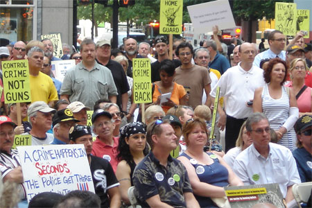 by Mark Liberator (e-mail: editor@liberator.net) [Updated July 19th, 2008]The Thompson Center in Chicago was the home for a pro-gun rally on July 11th. Hundreds of people turned out to hear speakers who promoted concealed carry laws for Chicagoans, Illinoisans, and citizens of other locals. The landmark 5-4 Heller ruling by The Supreme Court – re-affirming an individual’s right to own and operate guns – sparked the rally.